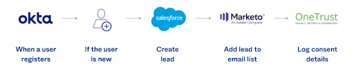 You can include additional applications and services to the registration and sign-in flow. For example, you can prompt a customer with GDPR data privacy information and request consent through a third-party provider like OneTrust. Once selected, this information can kick off other Workflows, such as storing customer consent preferences, informing data analytics, and sending the customer email notification.